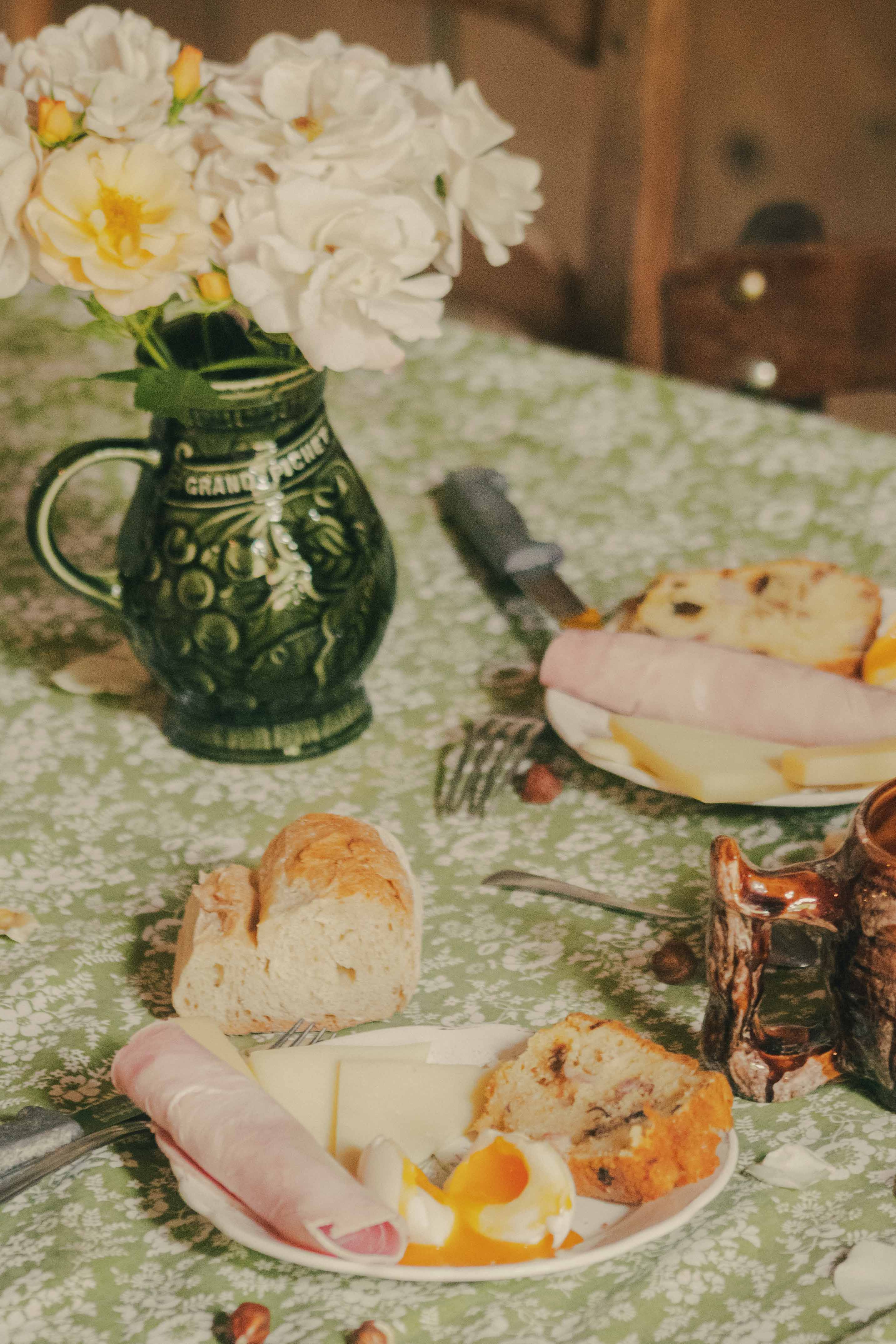 Bec salé : pain frais, fromage, jambon blanc, oeuf mollet, cake salé, boisson chaude, jus de fruits.