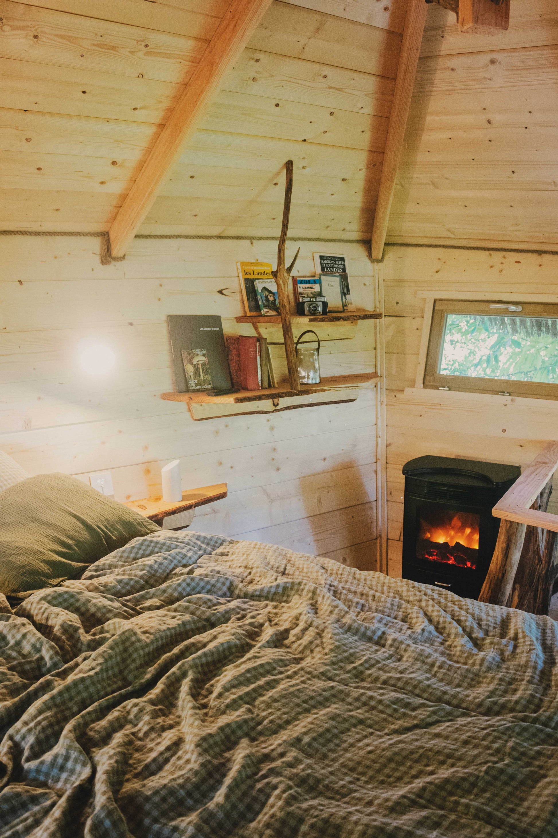 Se prélasser autour d'un feu de bois dans une cabane perchée à 7m de hauteur dans un vieux chêne, contempler le coucher de soleil sur le lac dans un bain nordique, observer les oiseaux et les écureuils depuis les fenêtres panoramiques, ou lire un livre sur la terrasse en pleine canopée. profitez de cet émerveillement en famille ou entre amis, grâce aux quatre couchages de La Cabanoun. Un lit superposé dans la pièce de vie ainsi qu'un lit double à l'étage.